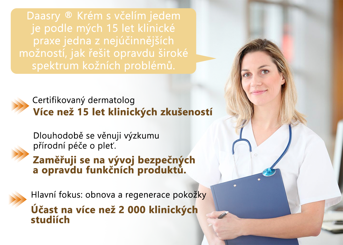 Jako dermatolog jsem vždycky chtěl najít účinné řešení proti vráskám. Po dlouhém výzkumu a testování s mým laboratoří, a taky po klinických zkouškách s více než 2 000 účastníky, jsme vyvinuli produkt, který řeší různé problémy pleti. Proto doporučuju 𝓓𝓪𝓪𝓼𝓻𝔂®Krém s včelím jedem s kyselinou hyaluronovou, retinolem, kolagenem, vitamínem C, peptidy a včelím jedem — multifunkční krém, který přirozeně a účinně cíli na vícero problémů pleti. Fakt věřím, že má skvělé účinky na regeneraci, opravu a celkové zdraví pleti.